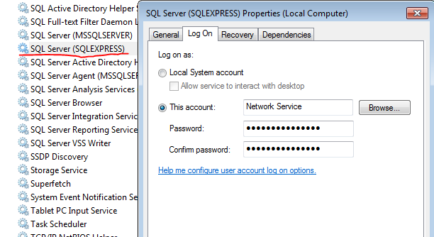 打开service,右击SQL Server(SQLEXPRESS),点击Log On标签,修改密码。然后再次登录,这回就可以了。如果还有其他的SQL Server对象不能登录,也要修改相应的service