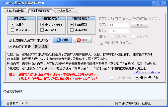 orz6火星文智能转换器。当你在跟QQ好友聊天或是写文章时,不管你现在使用的是智能ABC还是五笔字型,抑或是其它的输入法,你输入的内容将由ORZ6智能转换为火星文。本工具还提供“难”与“易”两种识别度不同的火星文转换方式。除了拥了市面上火星文转换器的普通功能之外,本工具还内置了简繁体转换,并且还独有强悍的“点阵字”转换器,让你秀出自己。全部功能,熔为一体,你还犹豫什么呢?立即下载体验吧!